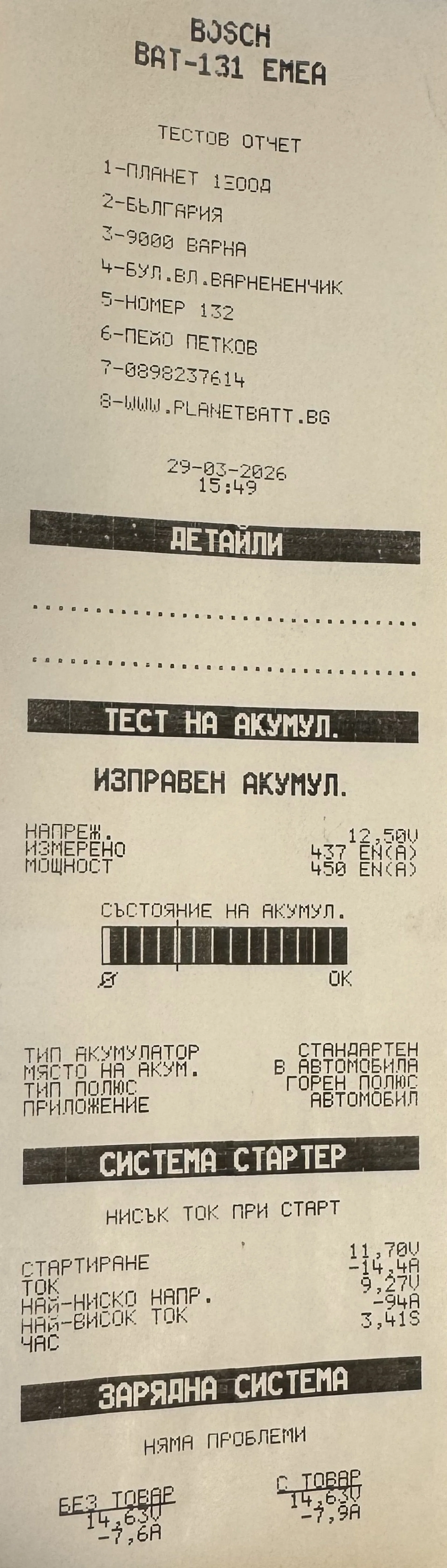 Тестерът има защита от обърнат поляритет и няма да стартира при грешно свързване. 2. Тест на акумулатораИзбира се: